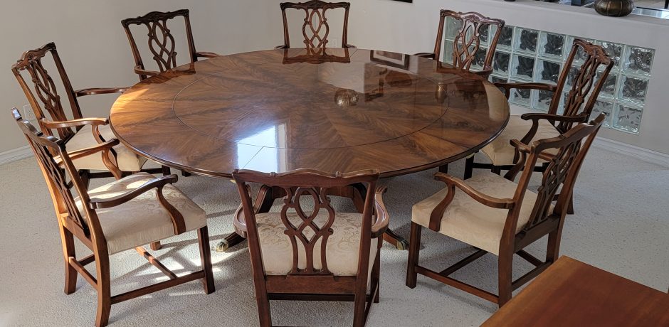 Chelsea Mahogany Dining table 7′ round, 8 chairs with arms. Seats, 22″ high, 18″. Comes with protective pads and storage cabinet