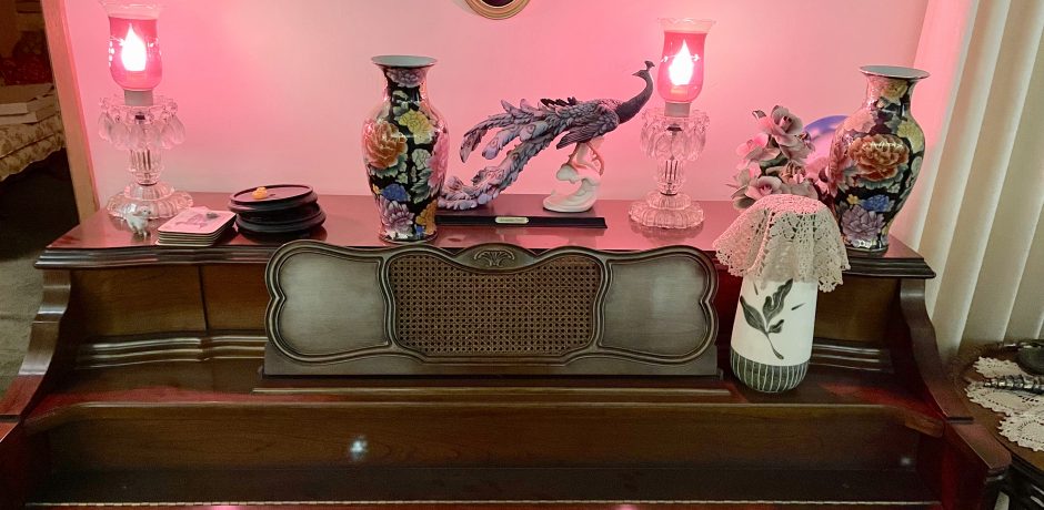 Features: Sterling Jewelry – Paintings – Stereo Equipment – Grandfather Clock with Mother of Pearl Inlay – Oriental Hand Crafted Hope Chest – Oriental Black Lacquer China Hutch & Dining Table with Oriental Upholstered Chairs – AKAI M-7 Recorder Vintage –